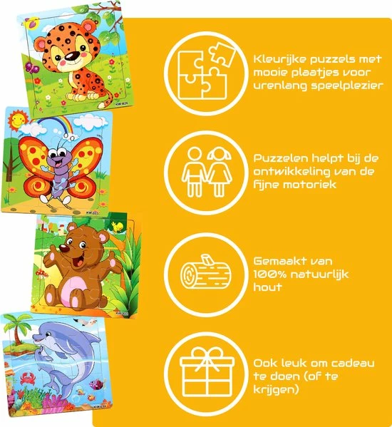 Set van 4 houten legpuzzels van verschillende dieren: een tijger, vlinder, dolfijnen en een beer. Alle vier de puzzels bevatten 9 stukjes.