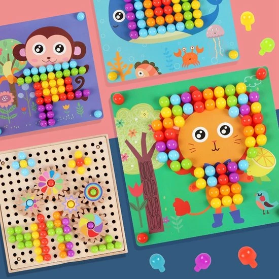 Dit moza?ekbord bestaat uit 10 verschillende puzzelkaarten. Op de puzzelkaarten staan vrolijke afbeeldingen van diverse dieren. Ook zitten er 6 verschillende kleuren pinnetjes bij. Op de afbeeldingen staat aangegeven welke kleur er gebruikt moet worden.