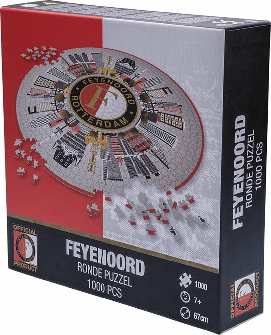 Deze Feyenoord-puzzel is een must have voor alle supporters. Een ronde puzzel met het logo van Feyenoord en de skyline van Rotterdam. Weet jij alle bekende Rotterdamse gebouwen aan elkaar te puzzelen?