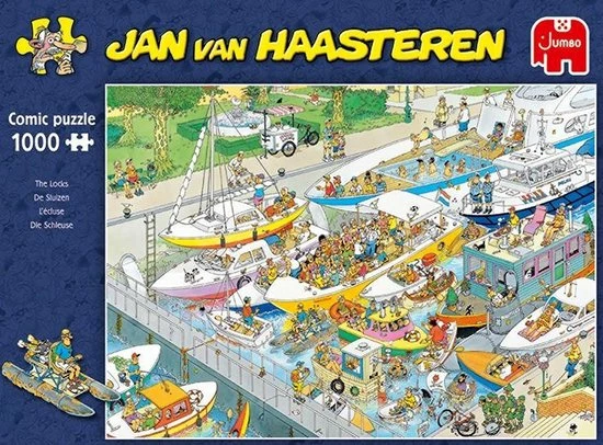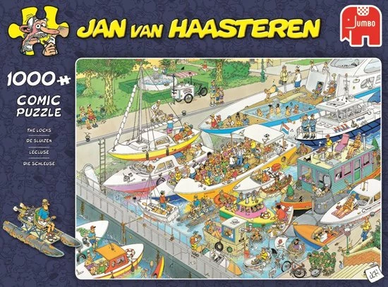 Wat een drukte in De Sluizen van Jan van Haasteren. Als dat maar goed gaat! Een geweldige puzzel met 1000 puzzelstukjes. Tijdens het puzzelen kom je steeds meer grappige details en taferelen tegen. Een kleurrijke plaat waarbij Jan van Haasteren wederom laat zien dat humor op een geweldige manier kan worden verwerkt in een puzzel. Jan van Haasteren puzzels zijn puzzels met veel kleur en details. Jan van Haasteren tekent al decennia lang humoristische platen die je steeds weer verrassen en laten lachen. De echte fans kennen de specifieke kenmerken van Jan van Haasteren en zoeken in elke puzzel direct naar de haaienvin, Sinterklaas, de handjes, het kunstgebit en Jan?s zelfportret. Jumbo heeft tientallen Jan van Haasteren puzzels in de collectie van 54 tot maar liefst 5.000 puzzelstukjes.