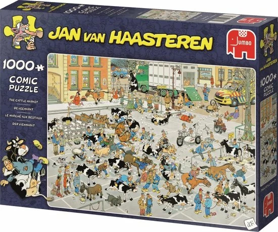 Jan van Haasteren de Veemarkt Puzzel 1000 Stukjes is een van de nieuwste puzzels van Jan van Haasteren! jan van Haasteren heeft ook deze keer weer met Jan van Haasteren de Veemarkt Puzzel 1000 Stukjes laten zien dat humor op een prachtige manier kan worden verwerkt in een puzzel. Jan van Haasteren puzzels zijn puzzels met veel kleur en details. Jan van Haasteren tekent al decennia lang humoristische platen die je steeds weer verrassen en laten lachen. De echte fans kennen de specifieke kenmerken van Jan van Haasteren en zoeken in elke puzzel direct naar de haaienvin, Sinterklaas, de handjes, het kunstgebit en Jan?s zelfportret. Jumbo heeft tientallen Jan van Haasteren puzzels in de collectie van 54 tot maar liefst 5.000 puzzelstukjes.