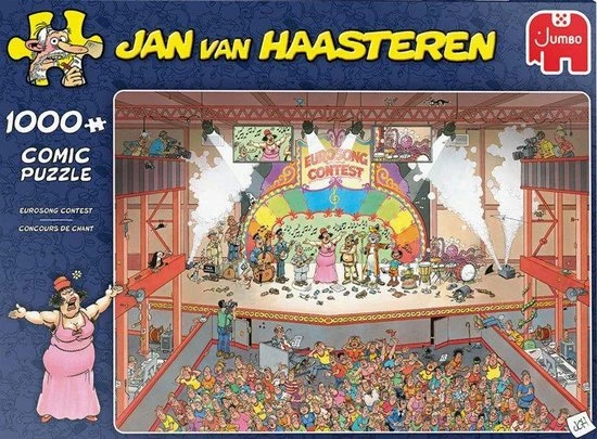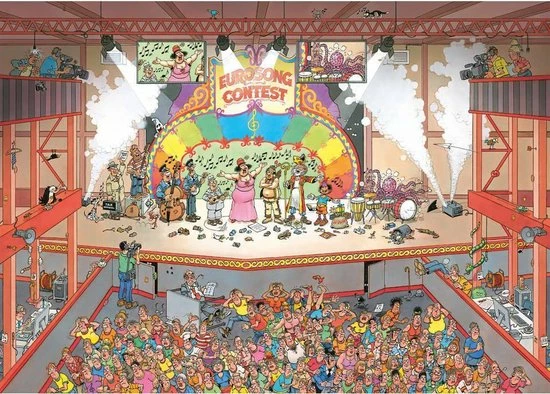Een schitterende Jan van Haasteren puzzel van het Eurovisie songvestival met 1000 stukjes. De Nederlandse editie van het Eurovisie songfestival gaat voorlopig niet door. Maar dat mag de pret niet drukken voor de grote puzzellaars, want met deze puzzel leg je het Eurovisie songfestival neer op jouw tafel. Ook deze puzzel van Jan van Haasteren bevat enorm veel specifieke details. Weet jij waar ze zitten?