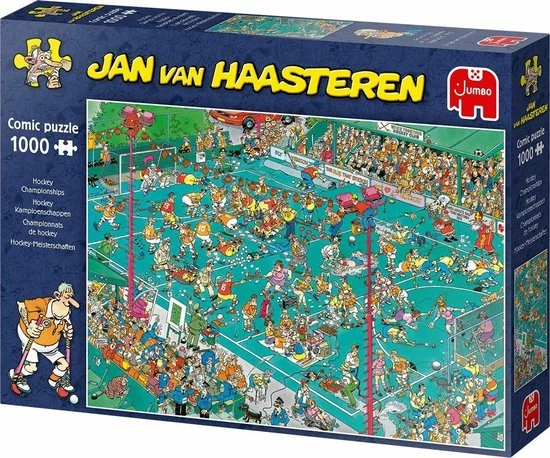 Tijdens Jan van Haasteren Hockey Kampioenschappen Puzzel 1000 Stukjes gaat echt alles mis! Niet alleen op het veld, maar ook in het publiek zijn er vele grappige details te zien. Op deze legpuzzel van Jan van Haasteren Hockey Kampioenschappen met 1000 Stukjes is het totale chaos! Tijdens het puzzelen van Jan van Haasteren Hockey Kampioenschappen Puzzel met 1000 Stukjes kom je steeds meer grappige details en taferelen tegen. Jan van Haasteren heeft ook deze keer weer laten zien dat humor op een prachtige manier kan worden verwerkt in een puzzel. Jan van Haasteren puzzels zijn puzzels met veel kleur en details. Jan van Haasteren tekent al decennia lang humoristische platen die je steeds weer verrassen en laten lachen. De echte fans kennen de specifieke kenmerken van Jan van Haasteren en zoeken in elke puzzel direct naar de haaienvin, Sinterklaas, de handjes, het kunstgebit en Jan?s zelfportret. Jumbo heeft tientallen Jan van Haasteren puzzels in de collectie van 54 tot maar liefst 5.000 puzzelstukjes.