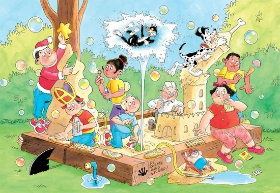 Het is een mooie dag en de Jan van Haasteren vriendjes leven zich uit in de zandbak. Van zandkoekjes tot grandioze zandkastelen, de mooiste creaties komen uit het zand tevoorschijn! De huisdieren Kat en hond Max komen ook een kijkje nemen, maar vooral Max is te enthousiast over de zandpret. Plots schept Jan te diep in de zanbak en springt er een leiding, of is het de tuinslag die per ongeluk in de zanbak is ingegraven? Kat is hier in ieder geval alles behalve blij mee! Deze humoristische puzzel van 240 stukjes is geschikt voor kinderen vanaf 6 jaar.