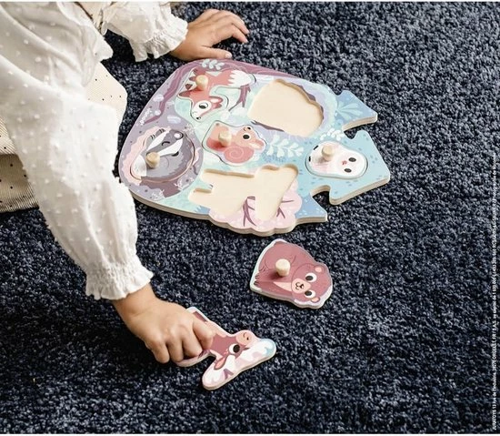Houten raampuzzel met grote knoppen waarmee kleine kinderhandjes gemakkelijk de puzzelstukken kunnen vastpakken. Deze puzzel is in bosdieren thema en heeft 6 knop puzzelstukken