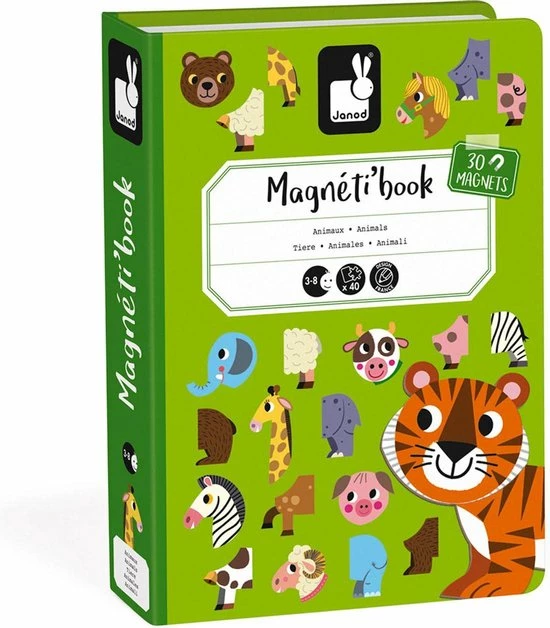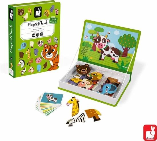 Educatief magneetspel van karton met dieren als thema. Bevat 30 magneten en 10 kaarten. Open het boek en maak hetzelfde dierentafereel als deze die op de kaart is aangegeven met behulp van de magneten. Het kind kan tevens andere gekke dieren maken aangezien alle stukken met elkaar verbonden kunnen worden.