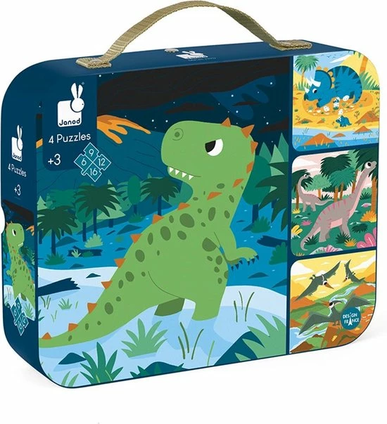 4 kartonnen puzzels van 6, 9, 12 en 16 stukjes met dinosaurussen als thema. Wordt verkocht in een mooie geschenkdoos met stoffen handvat.
