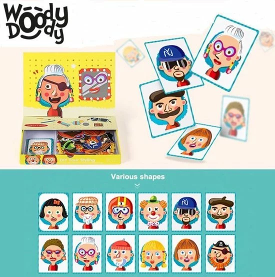 Verander van magnetische haren, baarden, oorbellen, brillen, mondjes, ogen en hoofdeksels zoals ze met de kaarten worden weergegeven.