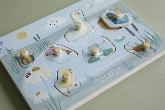 Maak kennis met Little Goose en zijn vriendjes. Herken hun vormen en unieke geluiden met deze leuke puzzel. Als je het diertje terugplaatst op het juiste plekje hoor je het plonsen, kwaken of zoemen. Ontworpen voor je kind om de levende wezentjes rond de vijver op het platteland te leren kennen. Deze puzzel met 7 diertjes en geluiden bevordert de oog- hand co?rdinatie en stimuleert de woordenschat van je kindje.