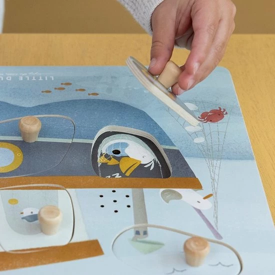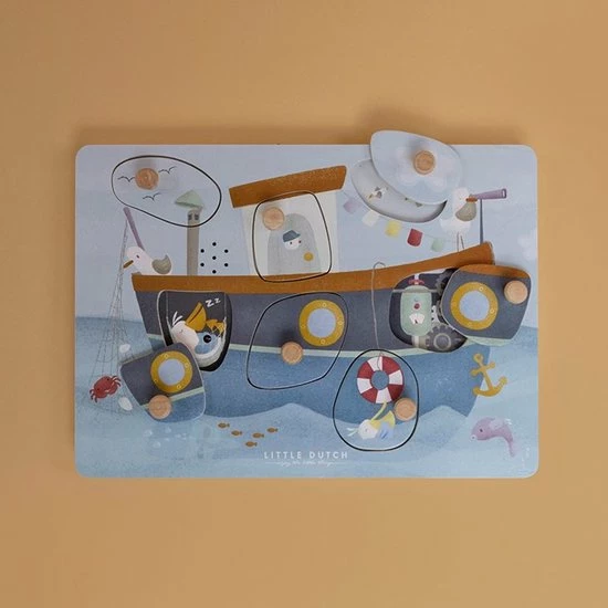 Hoeveel meeuwen kun je vinden bij de vissersboot die onderweg is naar Sailors Bay? Snurk, fluit en toeter mee! Til de puzzelstukjes ??n voor ??n op en ontdek de grappige geluidjes. De meeuwen blijven graag bij de boot om een visje te vangen! Weet je waar de pelikaan een dutje doet en wie er achter het roer staat? Vergeet vooral niet om te toeteren wanneer je klaar bent om op avontuur te gaan! Deze leuke puzzel van Little Dutch met 7 geluiden stimuleert de co?rdinatie en de woordenschat. De sensoren reageren wanneer er een puzzelstukje opgetild wordt en de afbeelding eronder onthuld. Wordt exclusief (2x AAA) batterijen geleverd.