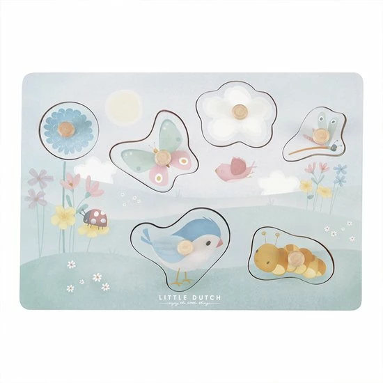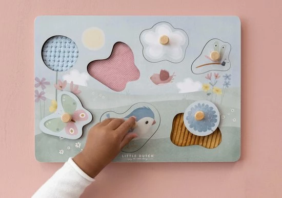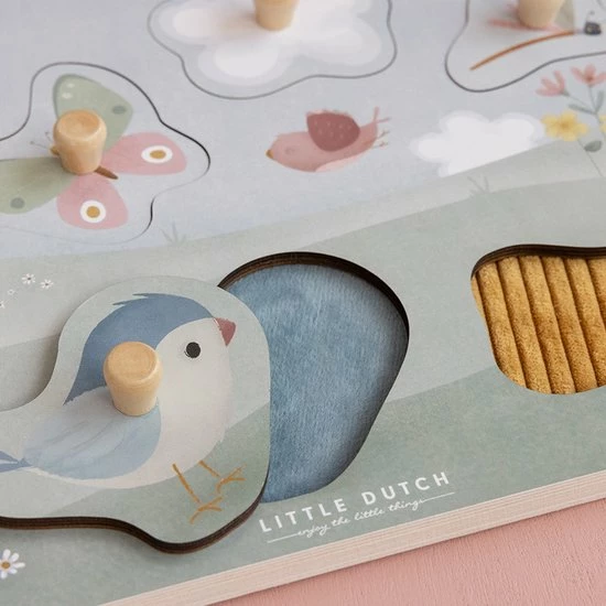 Wat zit er achter het vogeltje? Raak en voel de verschillende texturen onder elk stukje van de houten voelpuzzel. Is het zacht of geribbeld? Welke kleur zie je? Herkende jij de vormen van de rups en de vlinder? Deze voelpuzzel is geweldig educatief speelgoed voor kinderen, omdat het de fijne motoriek verbetert en de nieuwsgierigheid stimuleert door middel van zintuiglijk spel. Dankzij de houten pinnen kunnen kinderen de puzzelstukjes gemakkelijk hanteren en op de juiste plek leggen. Vanaf 12 maanden.