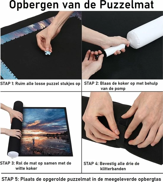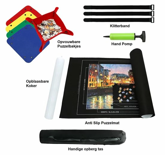 Met deze Puzzelmat wordt het heel makkelijk om je gemaakte Puzzel op te bergen en mee te nemen. Je legt alle Puzzelstukjes op de Puzzelmat, wanneer je klaar bent en de Puzzel wilt opruimen blaas je de koker op. Dit kun je doen met de meegeleverde pomp. Vervolgens rol je de Puzzelmat om de opblaasbare koker heen. Met de drie meegeleverde elastieken kun je de Puzzelrol perfect op zijn plaats houden. De Puzzelmat is nu een Puzzelrol. Nu blijft de Puzzel perfect op de Puzzelmat zitten. Vervolgens kun je de Puzzelmat in de opbergtas plaatsen. Zo kan je de Puzzelmat eenvoudig mee nemen naar elke gewenste plek. Je kan eenvoudig verder puzzelen waar en wanneer het jou uitkomt! De Puzzelmat set is geschikt voor puzzels van 500 tot 1500 Puzzel stukjes.