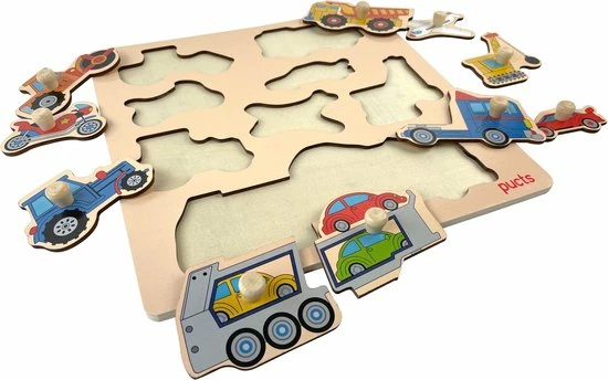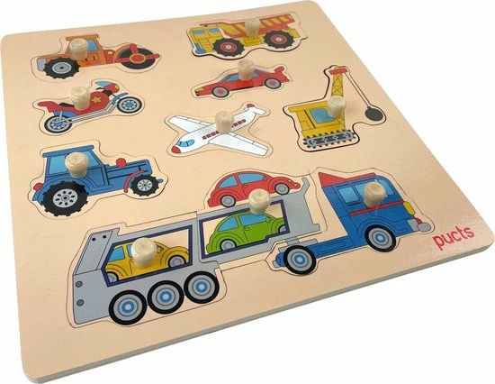 Een leuke houten puzzel met voertuigen voor kinderen vanaf 1 jaar. De puzzel heeft 8 verschillende voertuigen waarvan de vrachtwagen met autotrailer uit drie stukken bestaat.