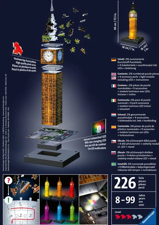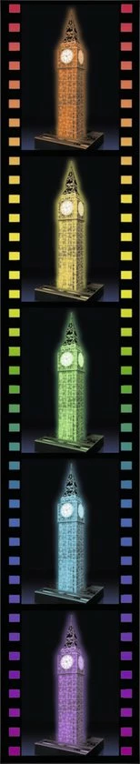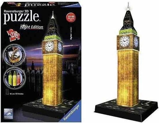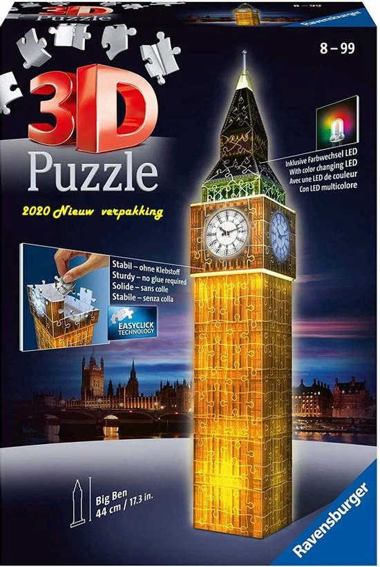 Uniek drie dimensionaal puzzelplezier, dat zijn de 3D gebouwen puzzels van Ravensburger! Puzzel prachtige 3D bouwwerken in elkaar en geef ze een mooi plaatsje op o. a. je wandplank of op het dressoir! De stevige plastic stukjes passen precies in elkaar. Zo bouw je vanuit gebogen, platte en opvouwbare stukjes een uniek model van de Big Ben, zonder lijm te gebruiken!