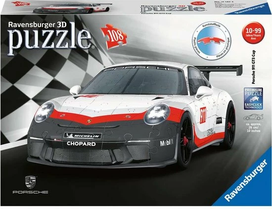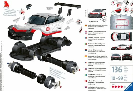 Bouw vanuit 108 gebogen, platte en vouwbare stukjes een uniek model van de Porsche GT3 Cup, zonder lijm te gebruiken! Een 3D puzzel van Ravensburger.