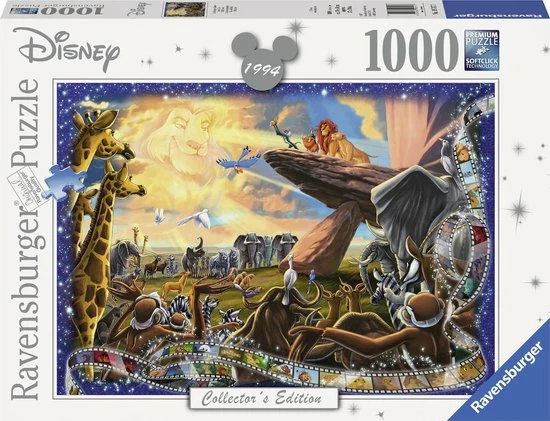 Ontsnap uit de realiteit en stap in de wereld van Ravensburger puzzels. Deze Ravensburger puzzel van 1000 stukjes is geschikt voor zowel beginnende als ervaren puzzelaars. En omdat onze geliefde puzzels een standaard formaat hebben, kun je het resultaat inlijsten en ophangen. Dankzij de met de hand gemaakte stansmessen is de vormvariatie van de stukjes oneindig. Jong en oud zullen genieten van deze Disney The Lion King puzzel met 1000 stukjes.