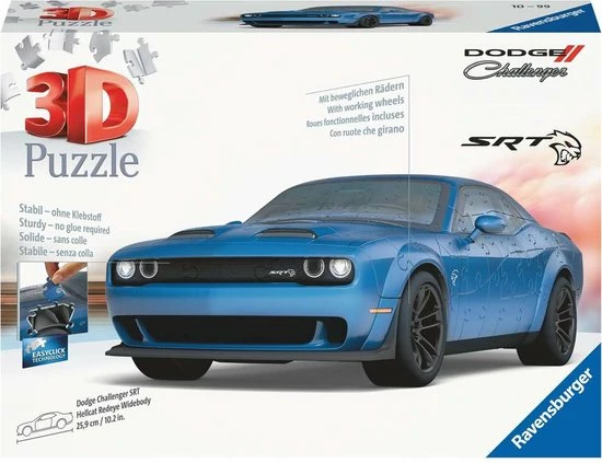 Met de “Dodge Challenger Hellcat Redeye Widebody” is de krachtigste muscle car ter wereld er nu ook als 3D-puzzel. Dankzij de ingenieuze EasyClick-technologie kunnen de puzzelstukjes zonder lijm in elkaar worden gezet tot een model dat tot in details lijkt op het origineel. En dankzij de in de accessoires meegeleverde roterende wielen kan hij zelfs rijden! Ge?llustreerde instructies en genummerde puzzelstukjes helpen bij het in elkaar zetten en zorgen voor onbeperkt puzzelplezier. Op een schaal van 1:18.