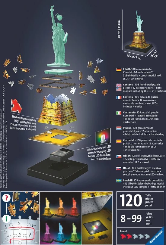 | Verpakkingsinhoud | 108, genummerde, puzzelstukjes, +, Vrijheidsbeeld, +, onderdelen, incl., LED, +, handleiding., Batterijen, zijn, niet, bij, het, product, inbegrepen. |