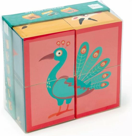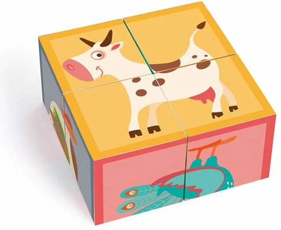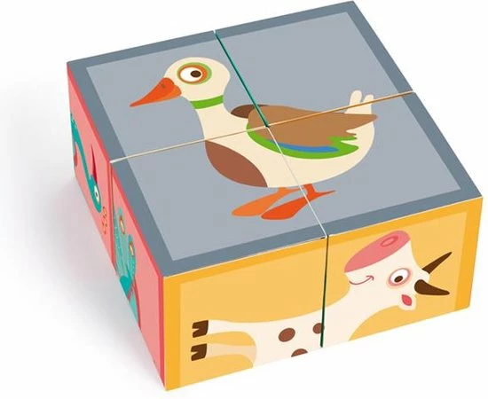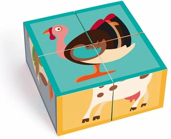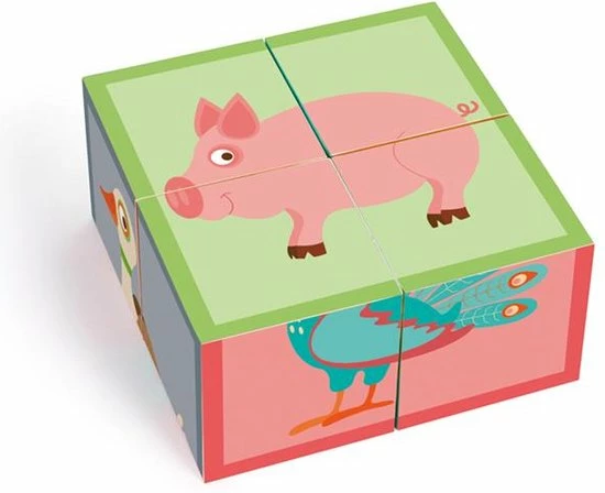 Een houten blokpuzzel van het merk Scratch. Aan elke zijde vind je verschillende boerderijdieren.