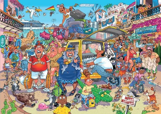 De hele familie is net gearriveerd om een vakantie vol zon, zee en sangria te vieren, maar hun schitterende hotel ziet er toch net wat anders uit dan in de fraaie brochure. Oma laat van schrik bijna haar zonnebrandcr?me uit haar handen vallen, en dat komt niet door de dure drankjes! Waardoor valt de vakantie van oma in het water, nog voordat ie goed en wel is begonnen? Dat is het beeld dat je puzzelt.